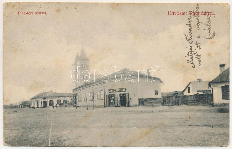 1912 Radnót, Radnuten, Iernut; Piactéri részlet, Michel B. üzlete, templom. Dunky Fivérek cs. és kir. udvari fényképészek kiadása / market square, shops, church (fa)