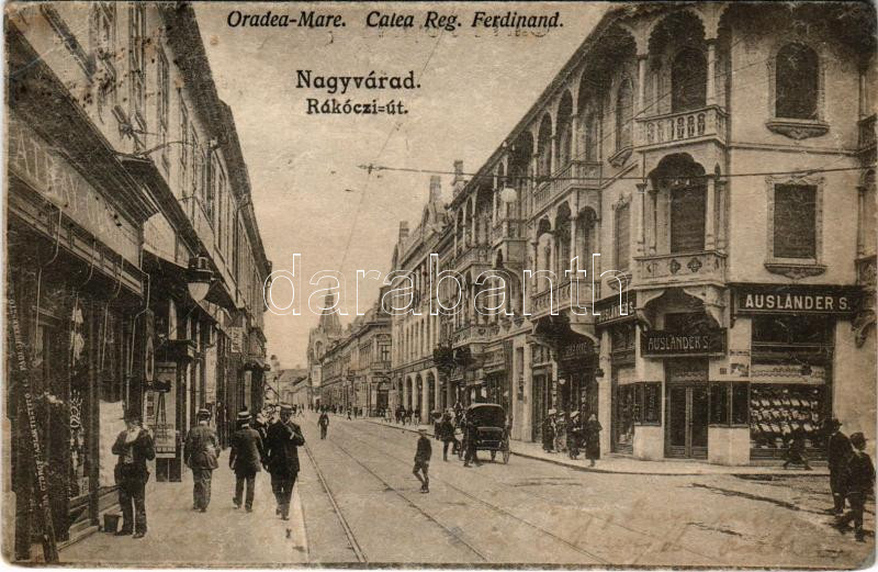 1925 Nagyvárad, Oradea; Rákóczi út, Ausländer S., Sebő Imre üzlete. Rigler József Ede R.T. kiadása / street view, shops (EB)