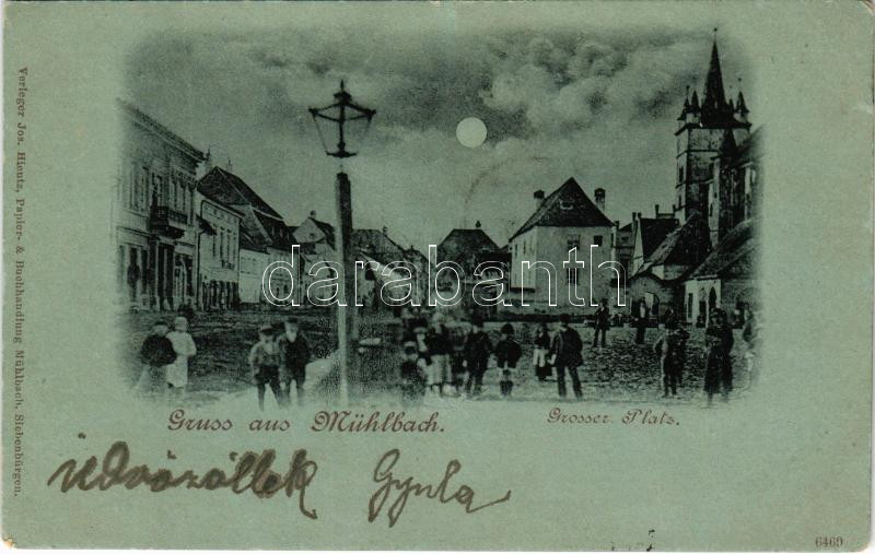 Szászsebes, Mühlbach, Sebes; Grosser Platz. Jos. Hientz / tér este holdfényben / square at night in moonlight (fa)