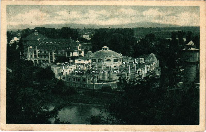 1929 Pöstyén, Piestany; látkép a Rádium hegyről, fürdő, víztorony / Pohlad z Radiumového vrchu / general view, spa, water tower (kis szakadás / small tear)