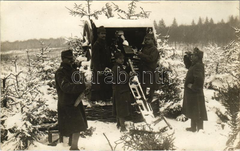 1916 Első világháborús osztrák-magyar katonák a fronton légvédelmi ágyúval, télen / WWI Austro-Hungarian K.u.k. military, soldiers in winter with fly-defense cannon. photo