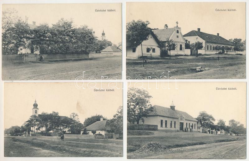 Kál (Heves) - 4 db RÉGI város képeslap: Római katolikus népiskola, utcakép. Baross nyomda kiadása