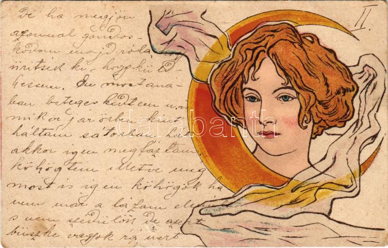 1900 Lady art postcard. litho + "MURÁNY - PELSŐCZ 191. SZ." vasúti mozgóposta bélyegző (lyuk / pinhole)