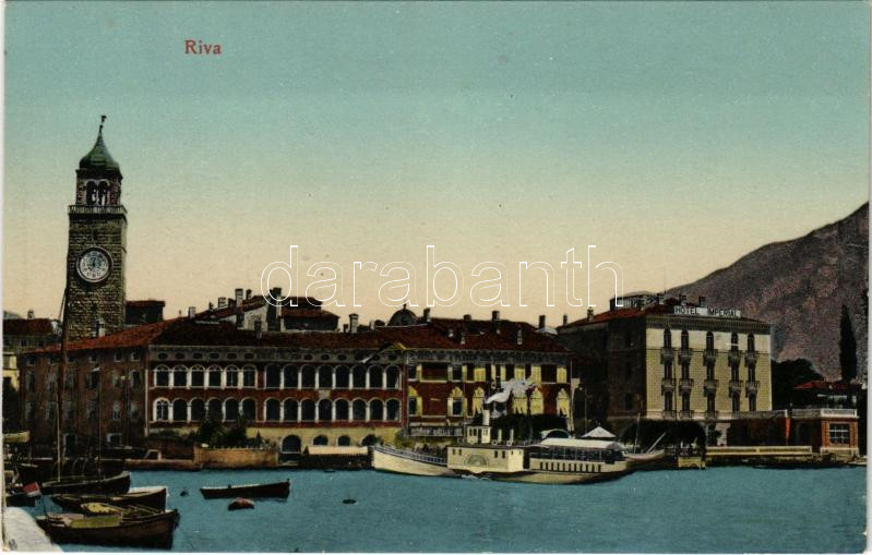 1908 Riva del Garda (Südtirol) / port, boat, steamship, clock tower, hotel