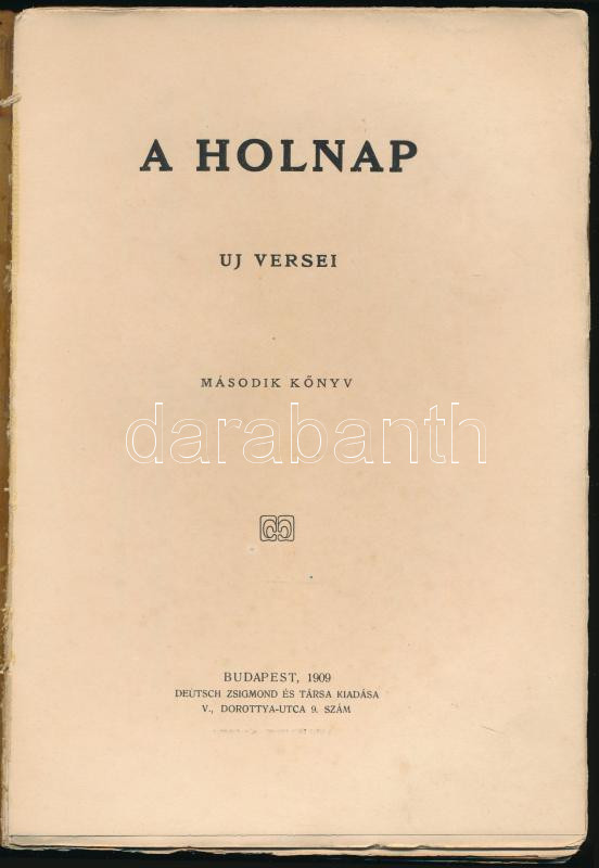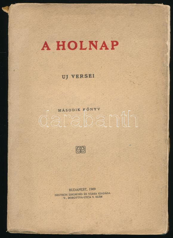 A Holnap új versei. Második könyv. Bp., 1909, Deutsch Zsigmond és Társa (Márkus Samu-ny.), 240 p. Első kiadás. Ady Endre, Babits Mihály, Balázs Béla és mások verseivel. Kiadói papírkötés, sérült, széteső állapotban.