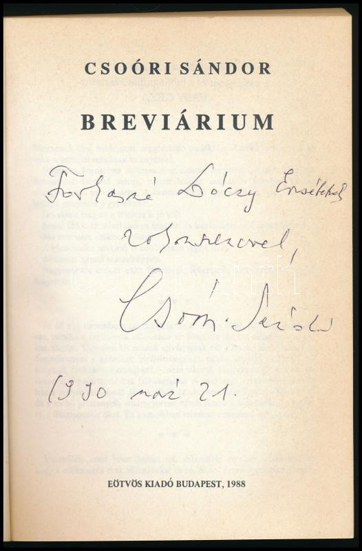 Csoóri Sándor: Breviárium. DEDIKÁLT! Bp., 1988, Eötvös. 252p. Kiadói papírkötés, jó állapotban.
