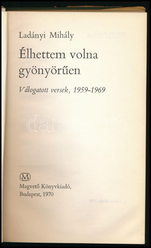 Ladányi Mihály: Élhettem volna gyönyörűen. Válogatott versek, 1959-1969. A szerző által dedikált! Bp., 1970, Magvető Könyvkiadó. Kiadói egészvászon kötés, sérült papír védőborítóval.