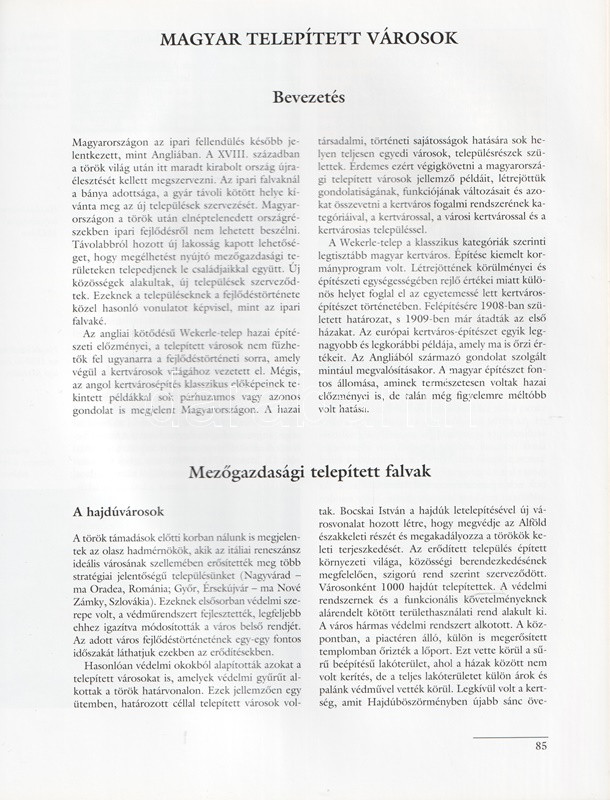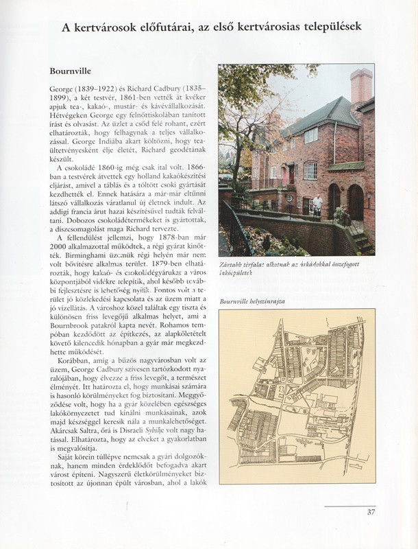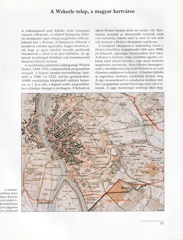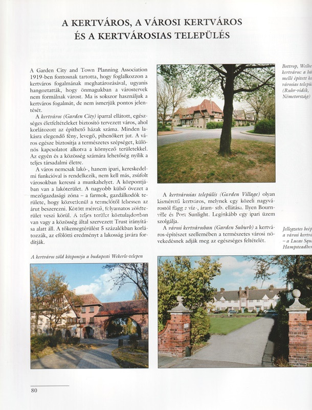 A kiemelt kormányzati programként létrehozott első magyar kertváros, Wekerle-telep alapításának 100. évfordulója alkalmából megjelentetett képes urbanisztikai album és tanulmány a kertváros-mozgalom angliai és magyarországi történetét tekinti át. Urbanisztikai kötetünk elsőként a kertváros-építés eszméjéhez vezető okokat elemzi, majd méltatja a kertvárosok tervezőasztalon maradt és megvalósult példáit. Az angliai vizsgálódást követően a munka a hazai munkás- és tisztviselőtelepek: a Wekerle-telep, a Tisztviselőtelep, valamint a győri és dunakeszi kertvárosok építészeti formakincsét elemzi.