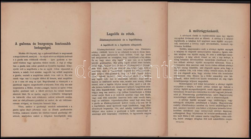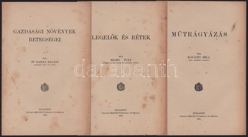 3 db mezőgazdasági témájú kiadvány: Barna Balázs: Gazdasági növények betegségei.; Szabó István: Legelők és rétek.; Kovácsy Béla: Műtrágyázás. Bp., 1910, Pallas-ny., 14 p.; 15 p.; 20 p. Tűzött papírkötés, részben foltos.