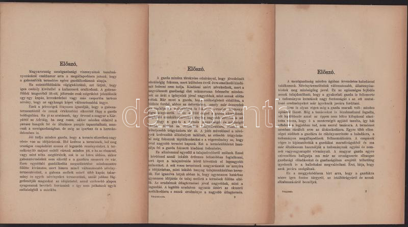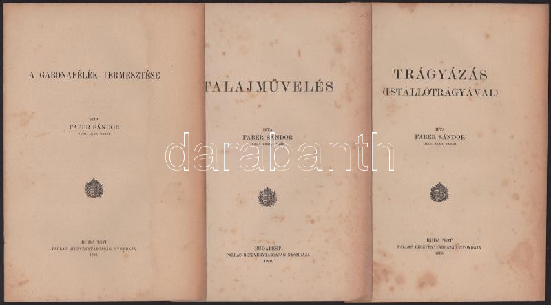 3 db mezőgazdasági témájú kiadvány: Faber Sándor: A gabonafélék termesztése.; Talajművelés.; Trágyázás (istállótrágyával). Bp., 1910, Pallas-ny., 23 p.; 20 p.; 20 p. Tűzött papírkötés, részben foltos.