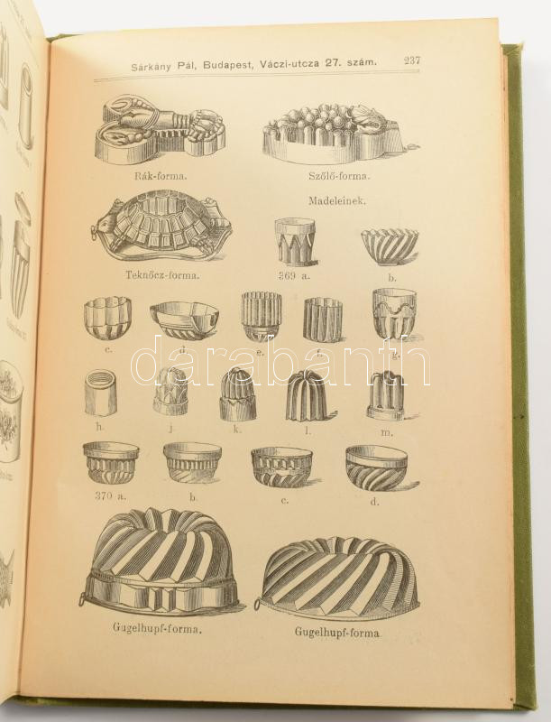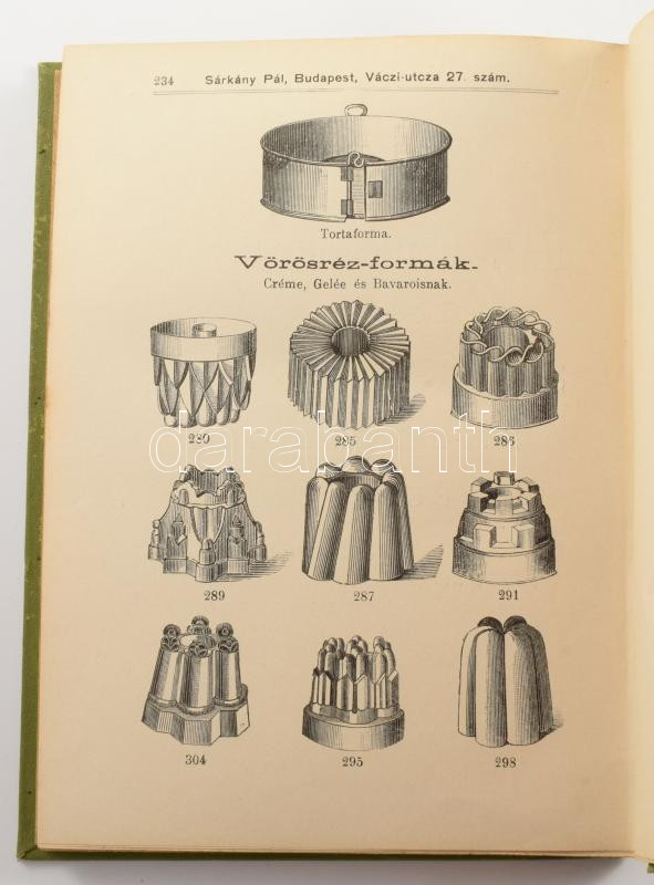 Hegyesi József cukrász, udvari cukrászmester szakmunkája először 1888-ban jelent meg. Példányunk a mű negyedik, javított és bővített kiadásából való. A receptek után, a 233. oldal után a süteménykészítéshez szükséges öntőformák képes ajánlója.