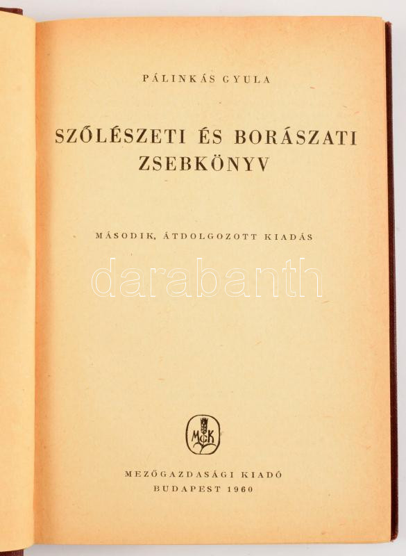 Pálinkás Gyula: Szőlészeti és borászati zsebkönyv. Szerk. és az előszót írta: Feyér Piroska. Bp., 1960, Mezőgazdasági Kiadó, 447+[1] p. Második, átdolgozott kiadás. Kiadói egészvászon-kötés.