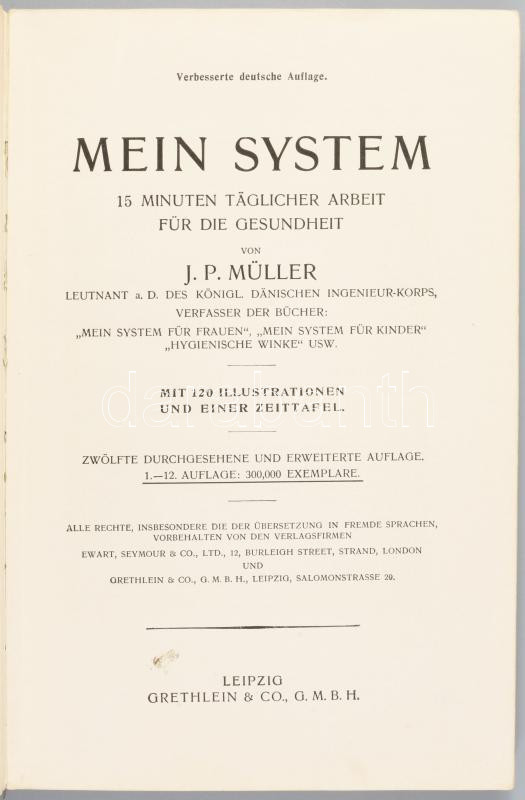 J. P. Müller: Mein System. 15 Minuten täglicher Arbeit für die Gesundheit. Leipzig,én.,Grethlein & Co. Német nyelven. Fekete-fehér képekkel illusztrált. Kiadói félvászon-kötés, kopott, foltos borítóval.
