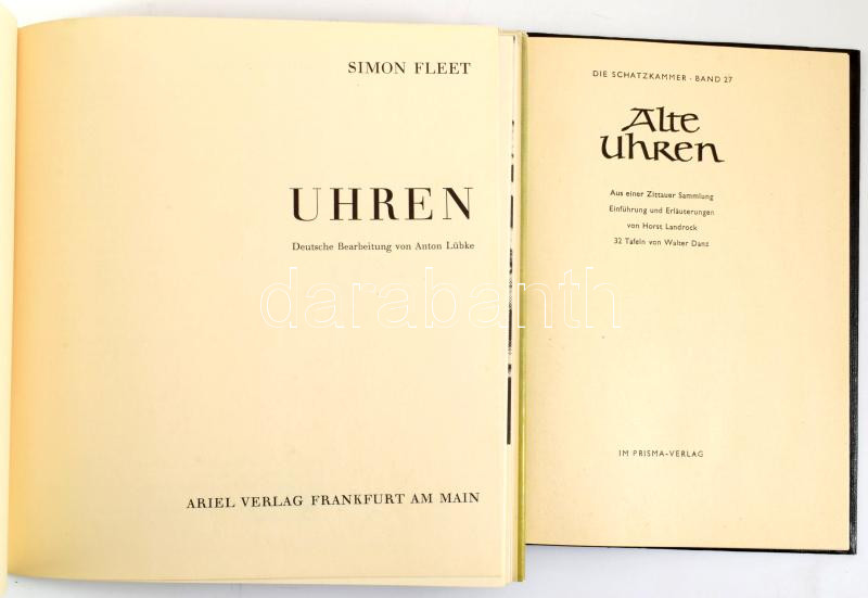 2 órás könyv: Simon Fleet: Uhren. Frankfurt, é.n. Ariel. Kiadói vászon-kötés, papír védőborítóval + Alte Uhren, Prisma Verlag. 35p. nagyrészt képanyag