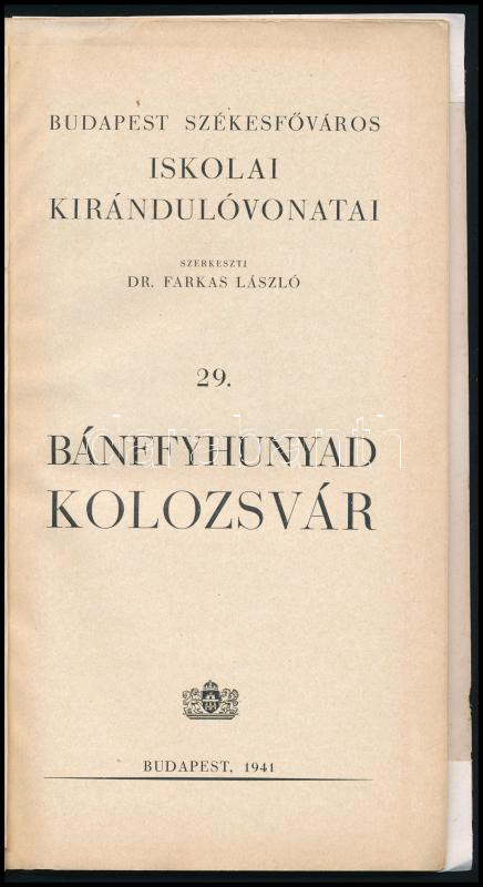 Budapest székesfőváros iskolai kirándulóvonatai 29.: Bánffyhunyad-Kolozsvár. Bp., 1941, (Székesfővárosi háziny.). Kiadói papírkötés, javított kötéstáblák.