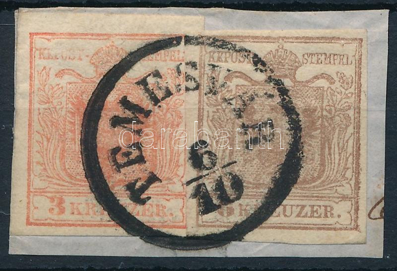 1850 3kr HP I lemezhibás bélyeg + 6kr HP I lépcsős bérmentesítés kivágáson "TEMESVÁR"