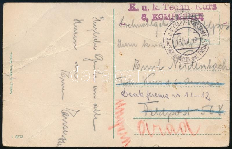 1918 Képeslap "EP SAN DANIELE del FRIULI a" + "K.u.k. Techn. Kurs 5. KOMPAGNIE" (gyűrött / creases)