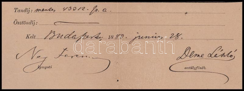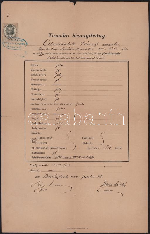 1880 Pilisi Ney Ferenc (1814-1889.) hírlapíró, színműíró, a pesti belvárosi reáliskola igazgatója autográf aláírása bizonyítványon