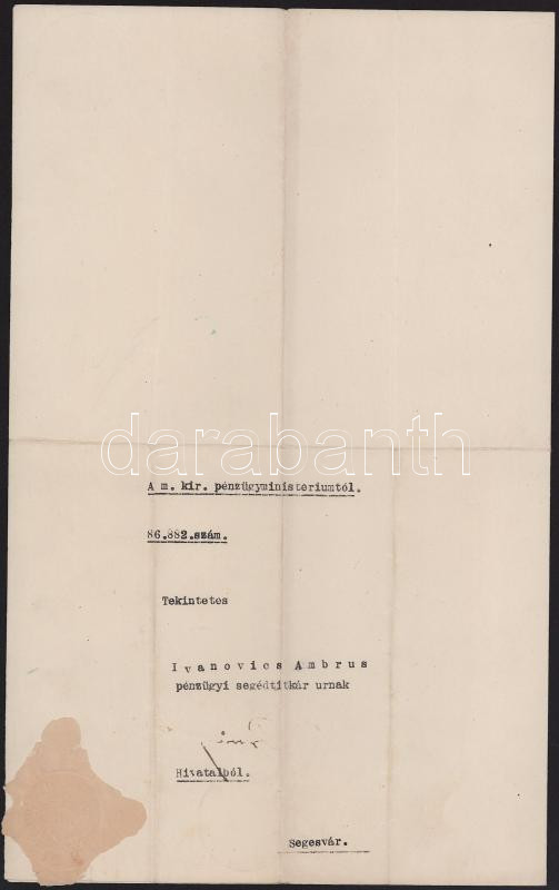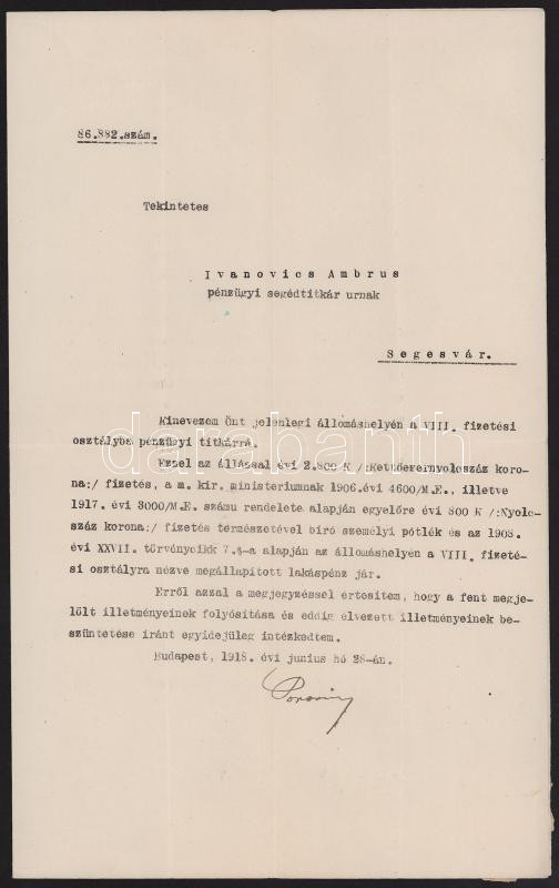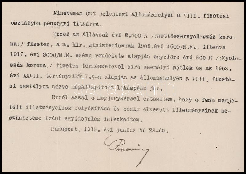1918 Popovics Sándor (1862-1935) pénzügyminiszter saját kézzel aláírt titkári kinevezése, szárazpecséttel, hajtva, jó állapotban