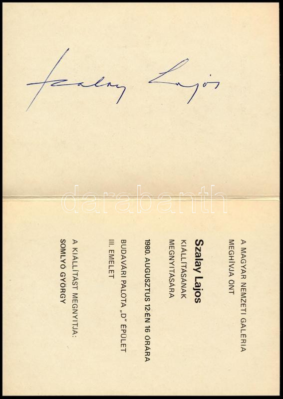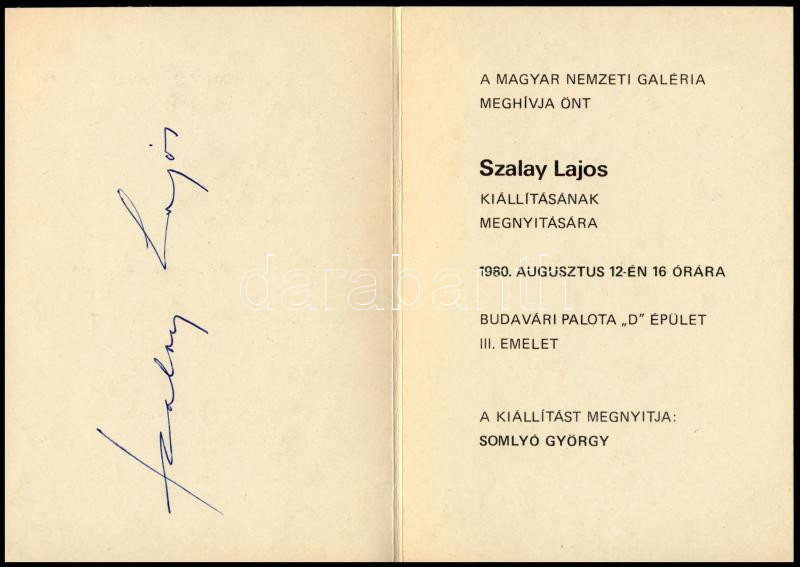 1980 Szalay Lajos (1909-1995) Kossuth-díjas grafikus autográf aláírása kiállítási meghívóján