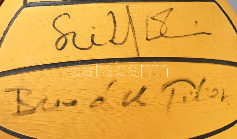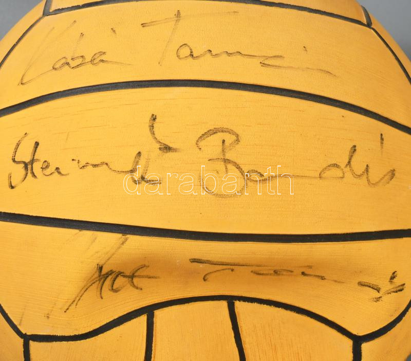 Magyar (többszörös) olimpiai bajnok vízilabdázók által aláírt vízilabda: Kásás Tamás, Benedek Tibor, Kiss Gergely, Gergely István, Steinmetz Barnabás, Varga, stb 8 db névvel.