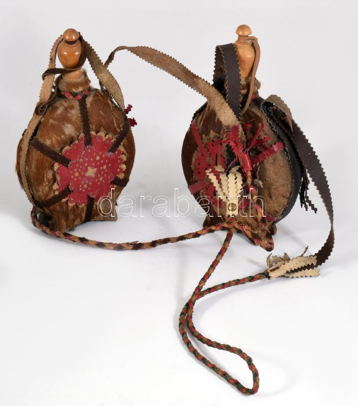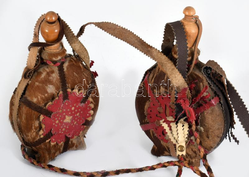 2 darab régi csikóbőrös kulacs, kopott, m: 19 cm