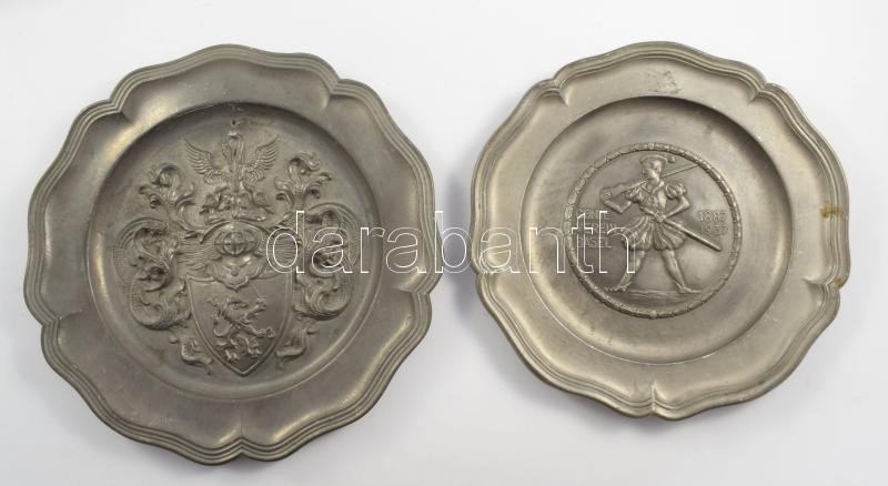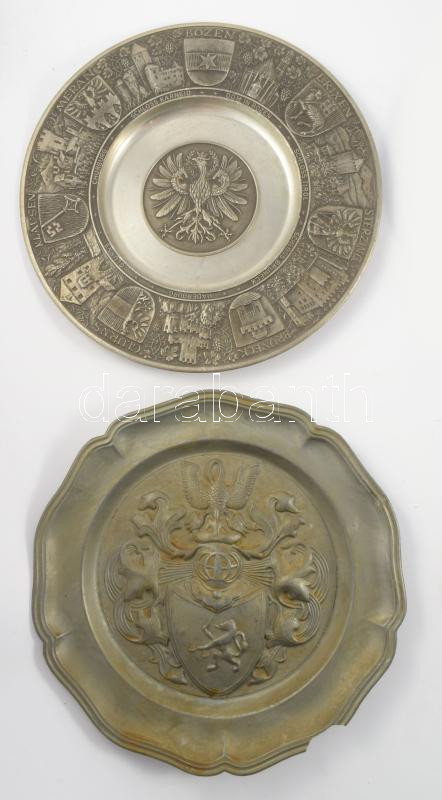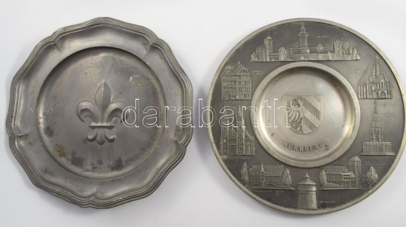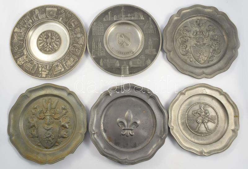 6 db különféle ón falitányér, közte Nürnberg, illetve Dél-Tirol (Südtirol) látnivalóival, d: 23 cm körül