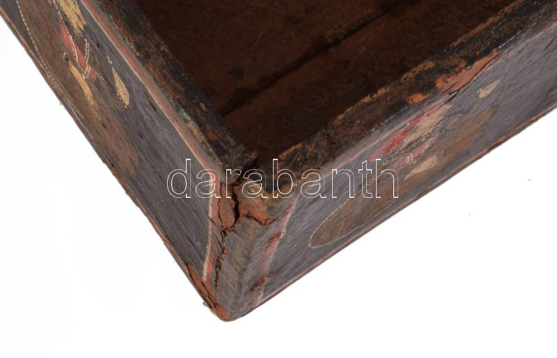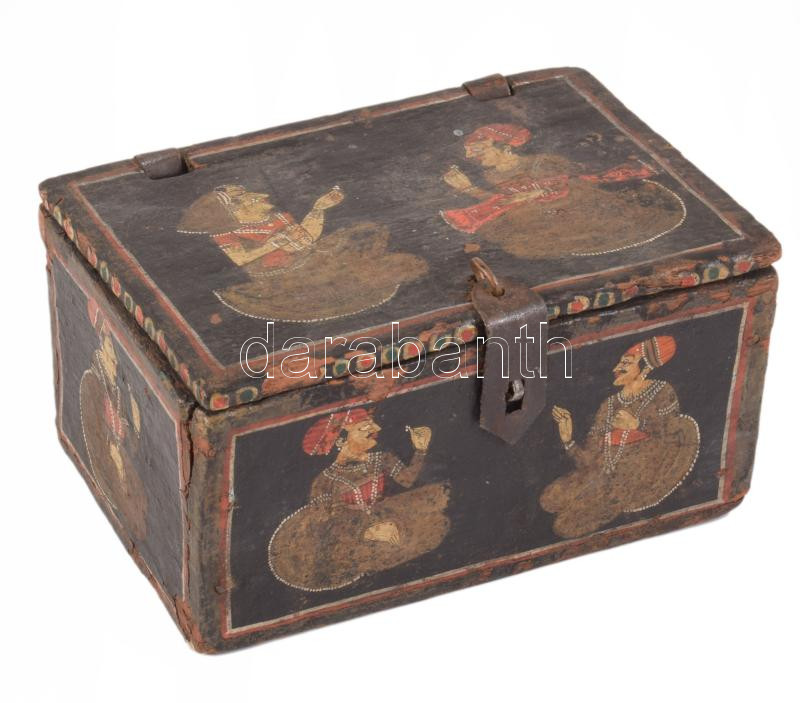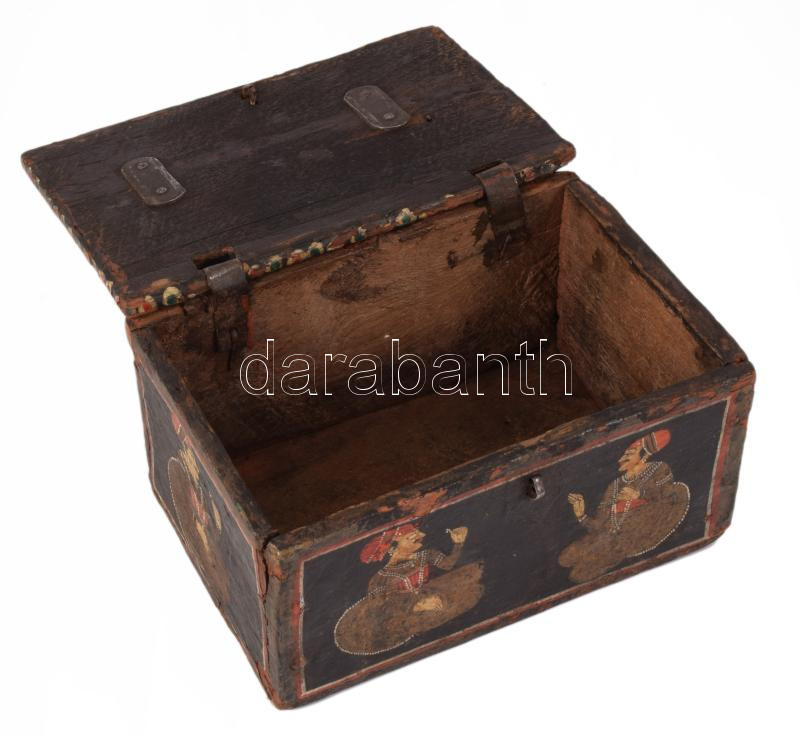 Antik indiai festett fa doboz, kopással, 13x18 cm