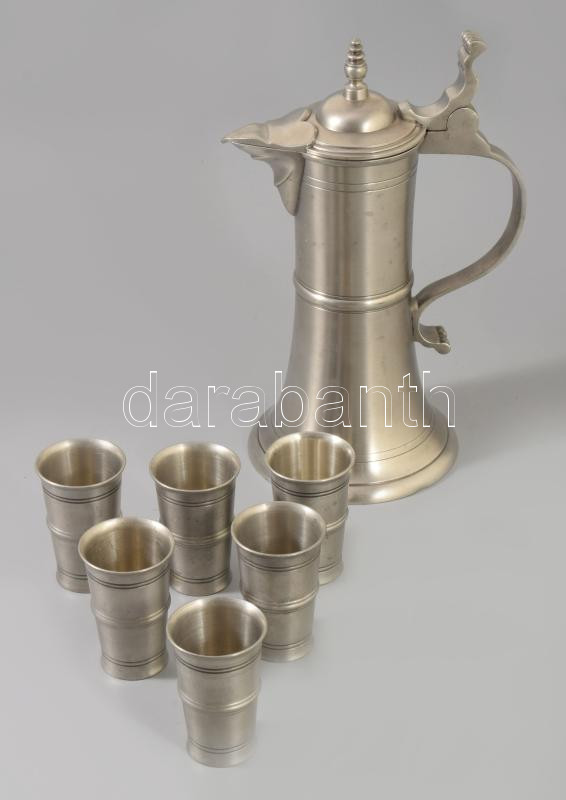Baehler svájci ón pálinkás készlet, jelzett, 6 személyes, m: 7-25 cm