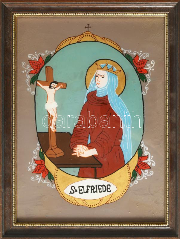 Festett üveg szentkép, keretben, 27x21 cm