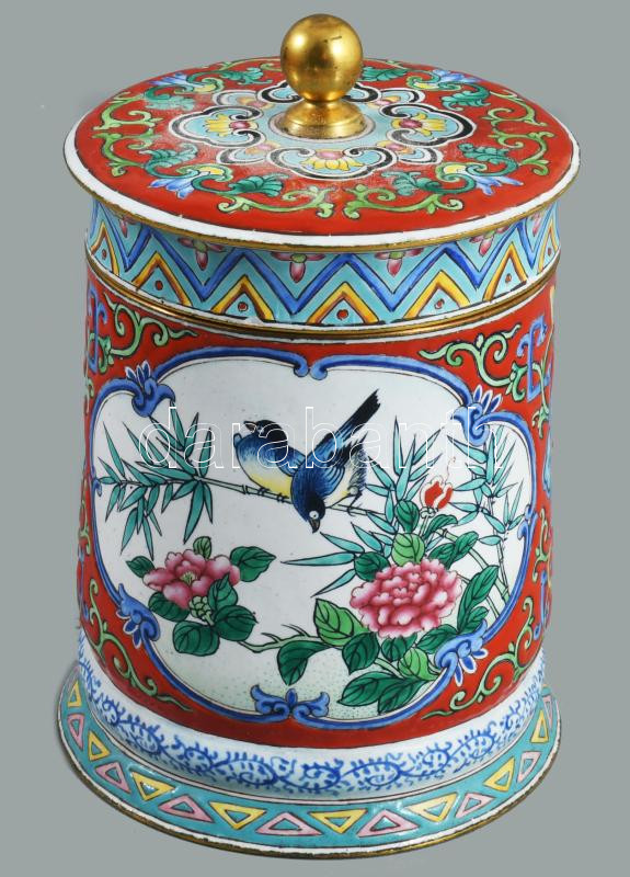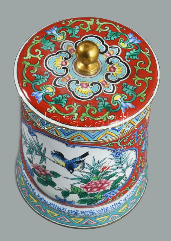 Kantoni kínai zománcozott fedeles edény, zománchibával, m: 12 cm