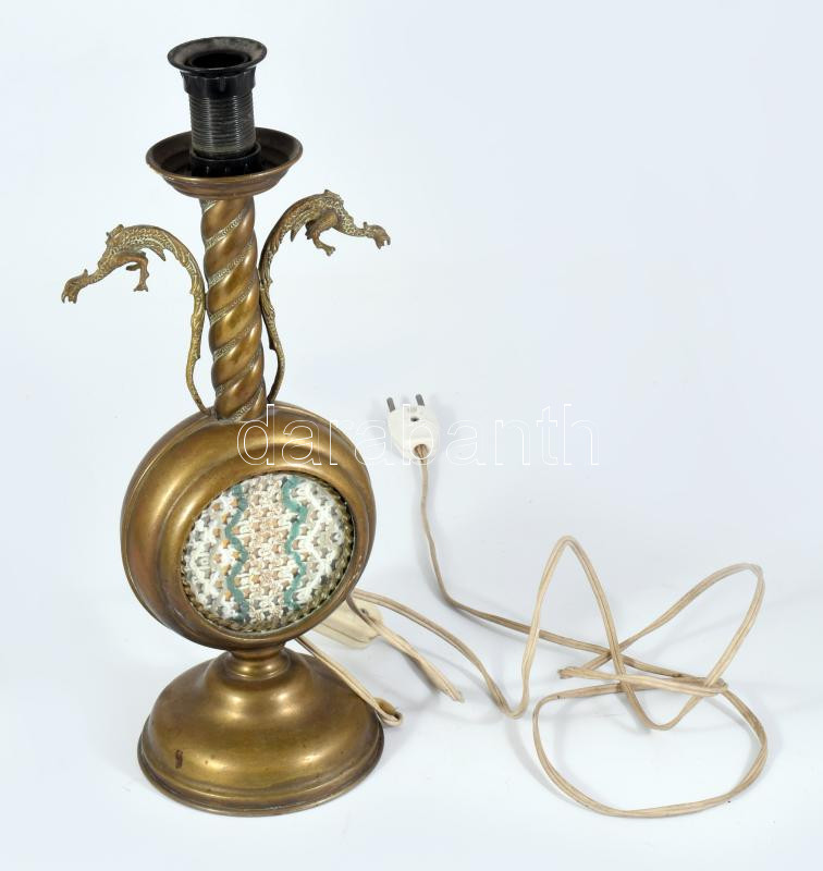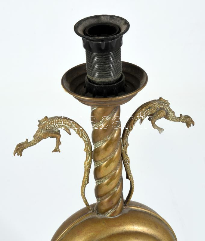 Réz asztali lámpa sárkány figurákkal, m: 35 cm