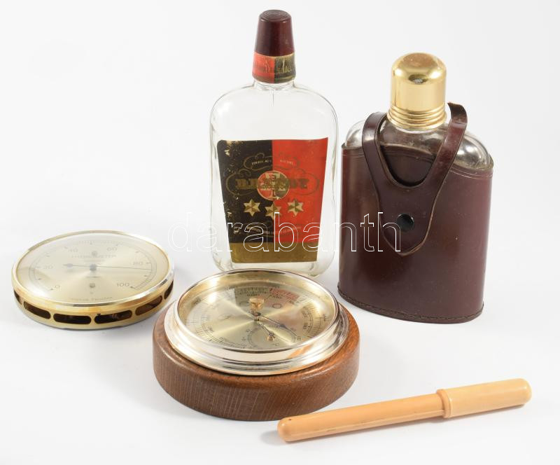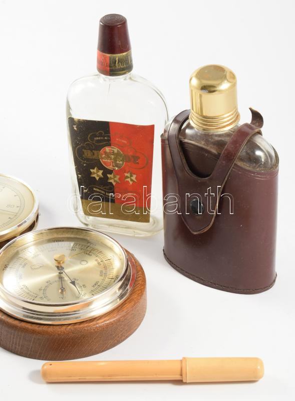Vegyes bolhapiac tétel: lázmérő, bőrborítású kulacs, bariméter, hygrometer