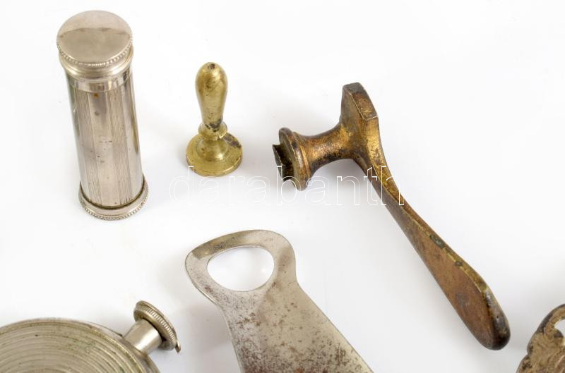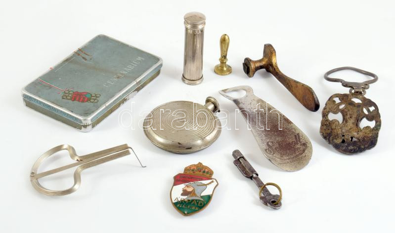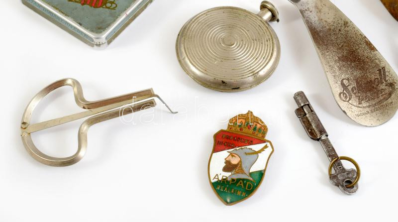 Vegyes fémtárgy tétel, közte "Budapesti III. ker. Árpád reálgimn[ázium]" zománcozott sapkajelvény, Schmoll Pasta reklámos cipőkanál, doromb, stb.