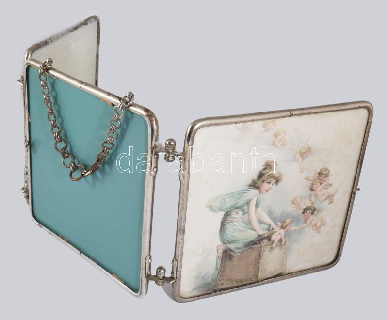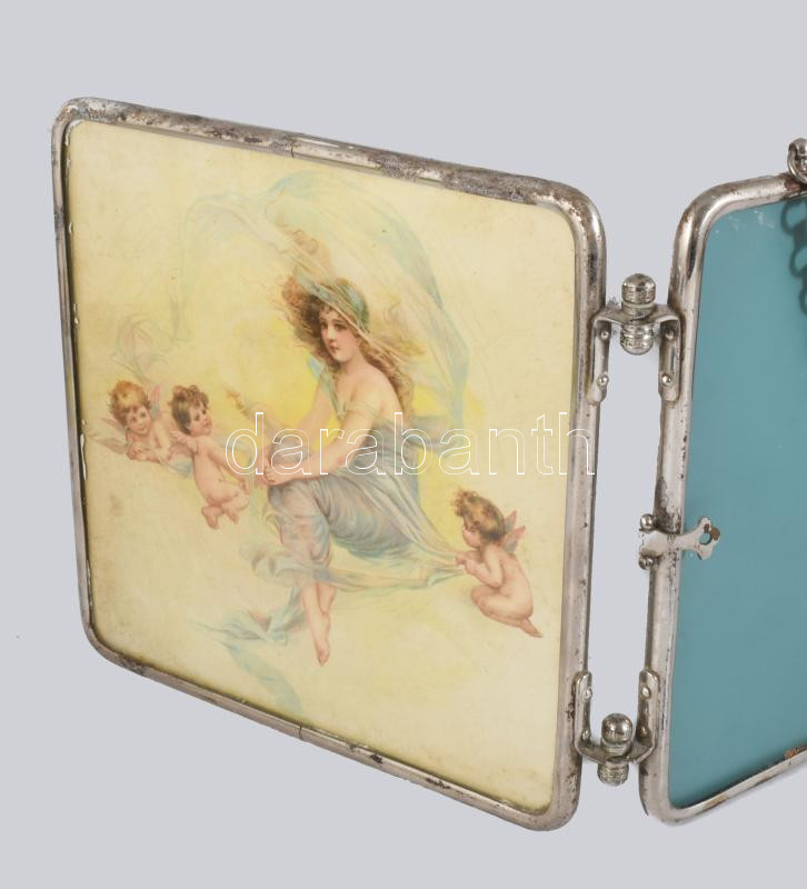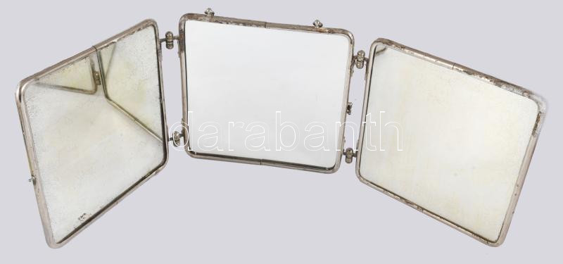 cca 1930 Krómozott szélű kihajtható tükör, nyomatokkal díszítve, 22x22 cm