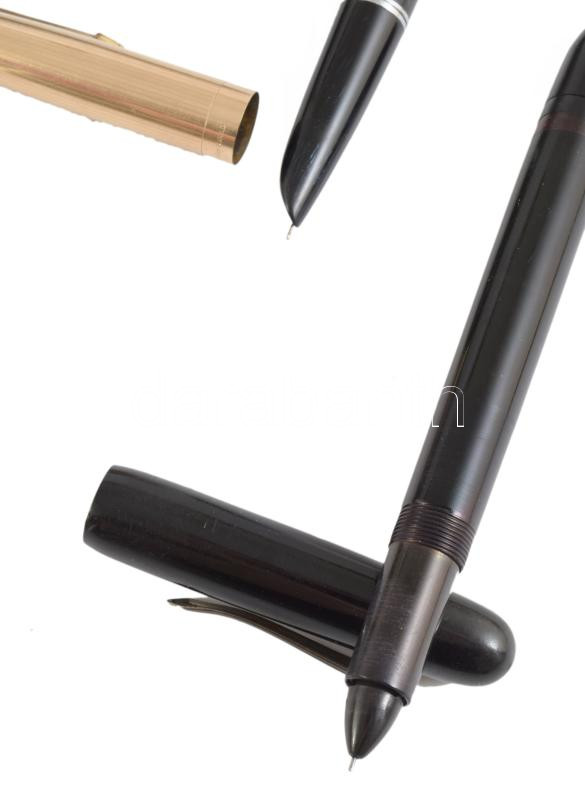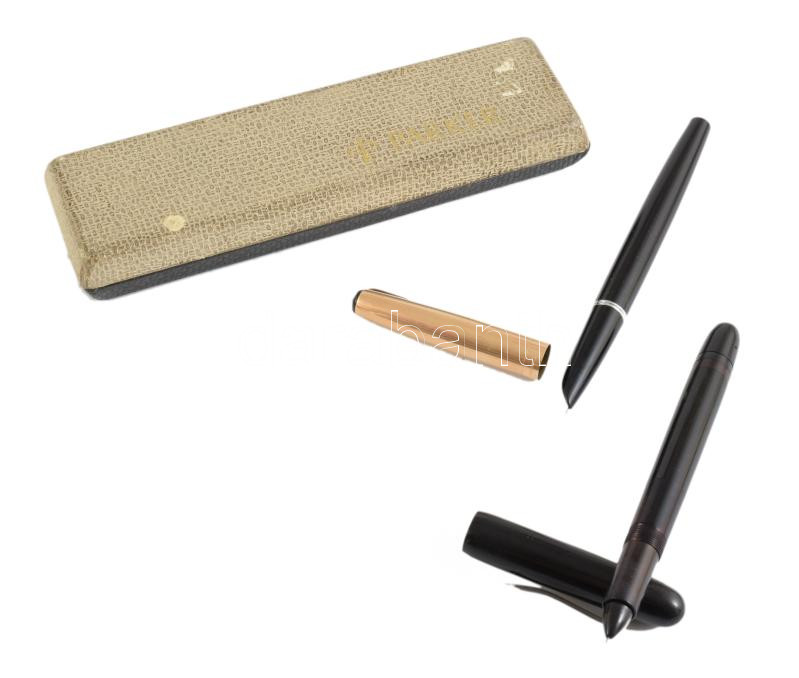 2 darab toll, közte Parker, tokban, tollvég bruttó 6,51g, "1/10 12ct R.Gold" jelzéssel (rolled gold, súlyának 1/10 része 12 karátos arany).