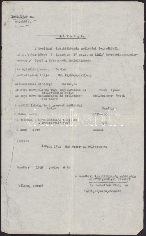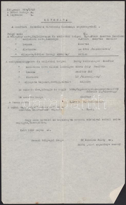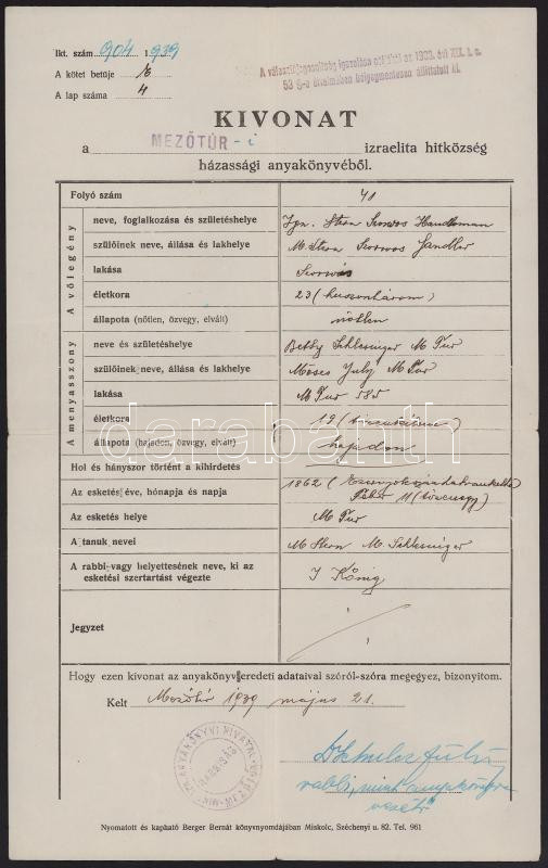 1939 A mezőtúri rabbi aláírása házassági kivonaton