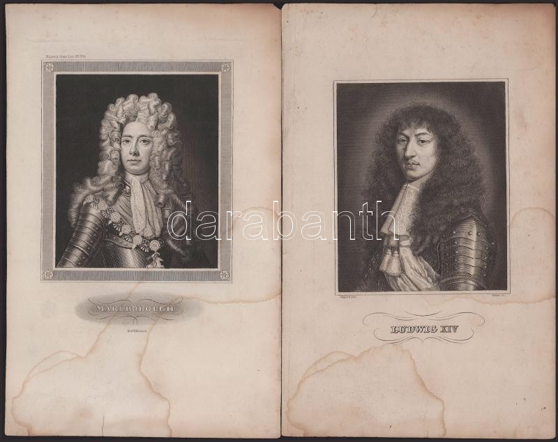 2 db metszet: Pierre Mignard (1612-1695) után Kühner metszése: XIV. Lajos francia király portréja, kis lapszéli sérüléssel, foltos, 23,5x15 cm + John Churchill, Marlborough első hercegének portréja, kis lapszéli sérüléssel, foltos, 23,5x15 cm