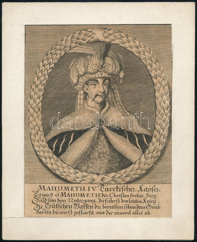 IV. Mehmed (1642-1693) oszmán szultán portréja. Rézmetszet, papír, paszpartuban, látható: 17x13 cm