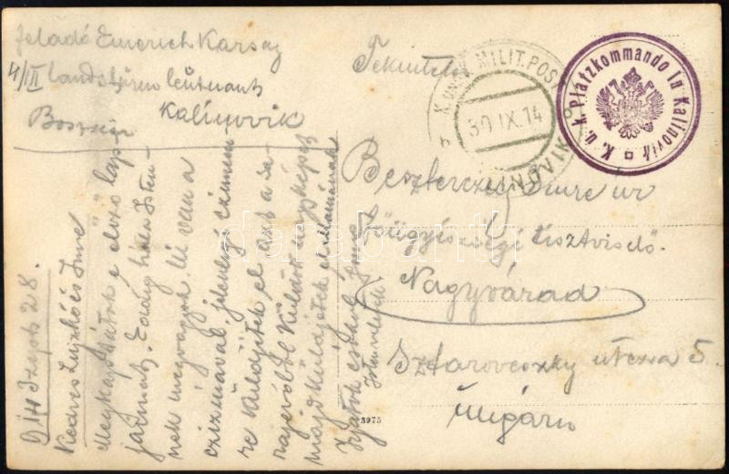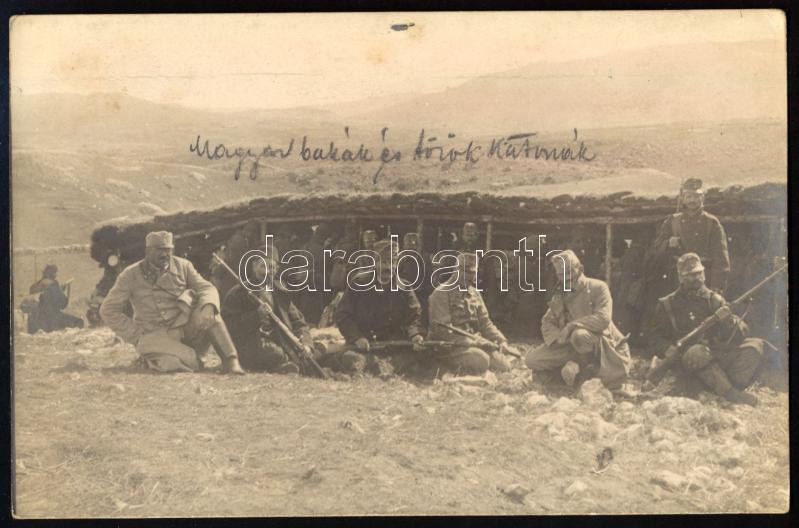1914 Kalinovik (Bosznia), magyar bakák és török katonák közös csoportképe, I. világháborús fotólap, megírva és tábori postaként elküldve, "K. u. k. Platzkommando in Kalinovik" bélyegzéssel, 9x14 cm
