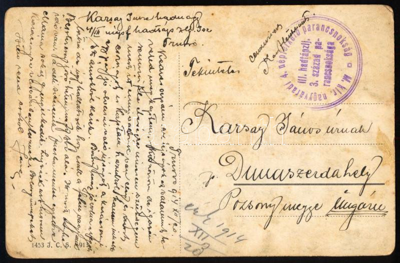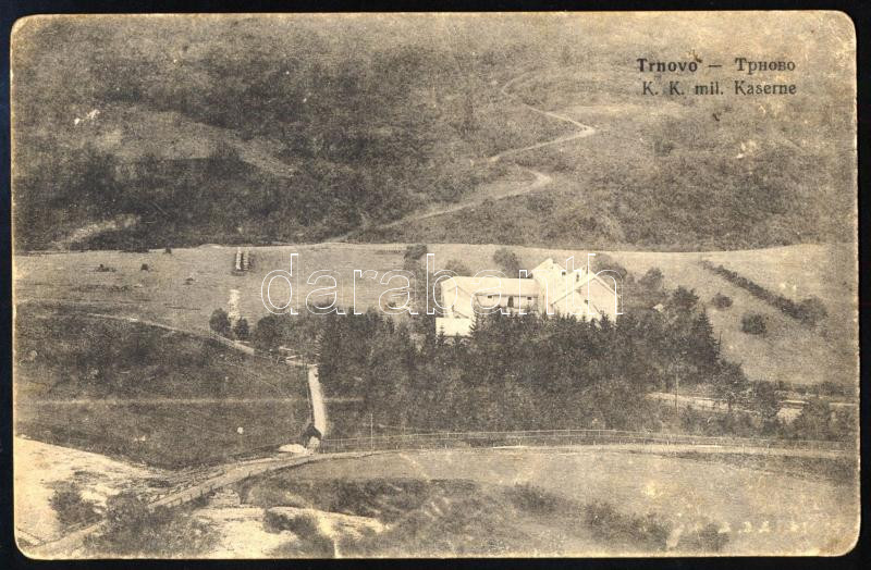 1914 Trnovo, osztrák-magyar katonai laktanyát ábrázoló képeslap, hátoldalán Karsay Imre hadnagy, a m. kir. nagyváradi 4. népfölkelő parancsnokság III. hadtápzászlóalj tagjának levelével, tábori postaként elküldve, 9x14 cm