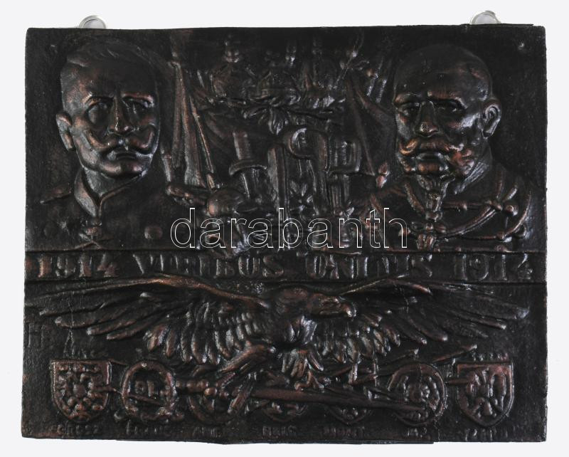 1914 Viribus Unitis festett hadifém plakett akasztóval, Ferenc József és Vilmos császár arcképével, 17x21 cm