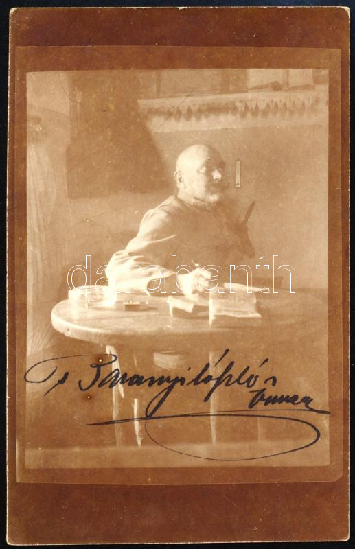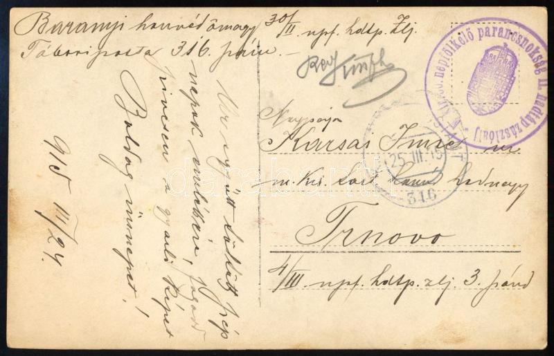1915 Baranyi László honvéd őrnagy, a m. kir. 30. honvéd népfölkelő parancsnokság II. hadtápzászlóalj tagjának saját kezűleg aláírt fotólapja, tábori postaként elküldve, bélyegzéssel, 14x9 cm