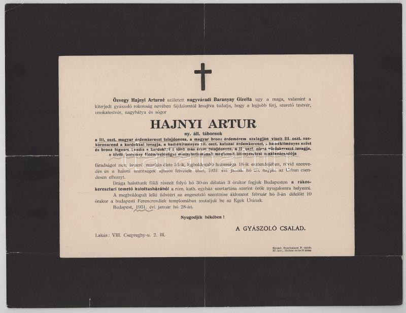 1931 Bp., Hajnyi Artúr (1875-1931) nyug. tábornok, a török kormány földmÃvelésügyi minisztériumának meghÃvott lótenyésztési szaktanácsadója, számos kitüntetés tulajdonosa halotti értesÃtÅ‘je, lapszéli szakadásokkal, 23x30 cm