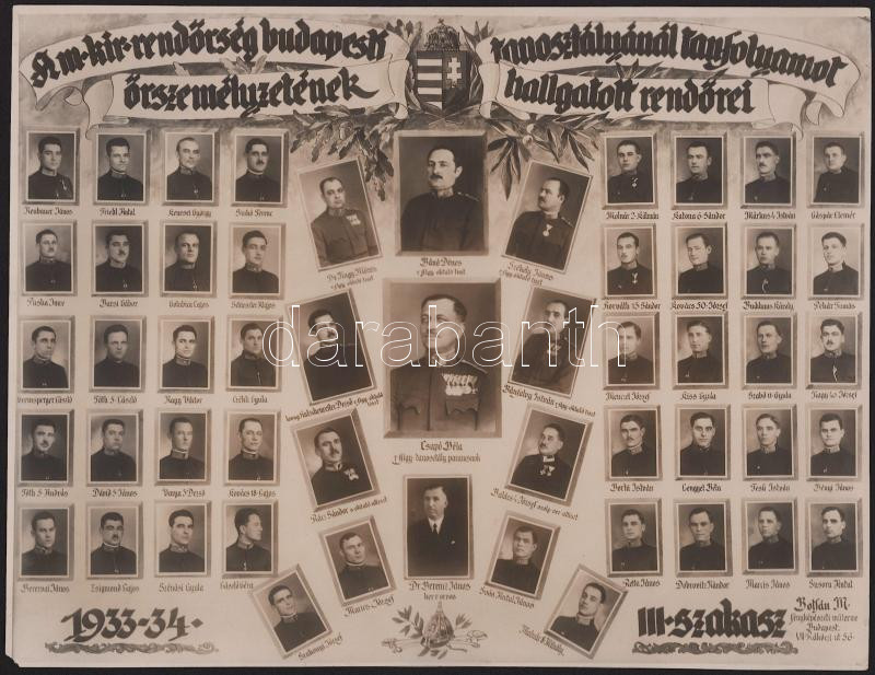 1933 A M. kir. rendőrség budapesti őrszemélyzetének tanfolyamot hallgatott rendőrei. III. szakasz tabló fotó 26x21 cm