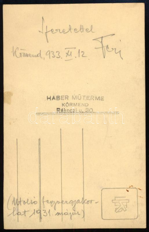 1933 Körmend, magyar katonatiszt számos kitüntetéssel, közte a Vaskorona-rend III. osztálya, német Vaskereszt, Katonai Érdemkereszt, stb.; fotólap Haber Frigyes körmendi műterméből, a hátoldalon saját kezű dedikációval, 13,5x8,5 cm