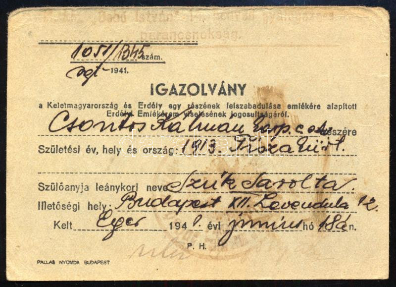 1941 Eger, Kelet-Magyarország és Erdély egy részének felszabadulása alkalmából alapított Erdély Emlékérem igazolvány