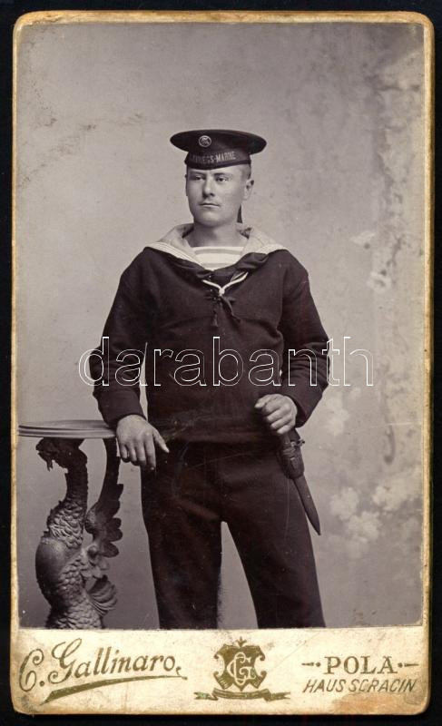 cca 1910 Császári és Királyi Hadtengerészet matrózának keményhátú fotója (k.u.k. Kriegsmarine), Pola, Cesare Gallinaro, foltos, a karton szélein kopásnyomokkal, 10x6 cm