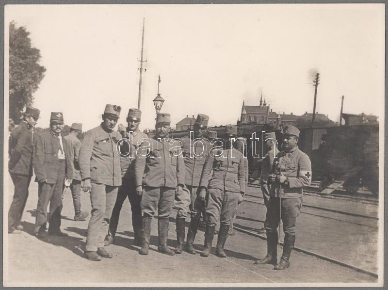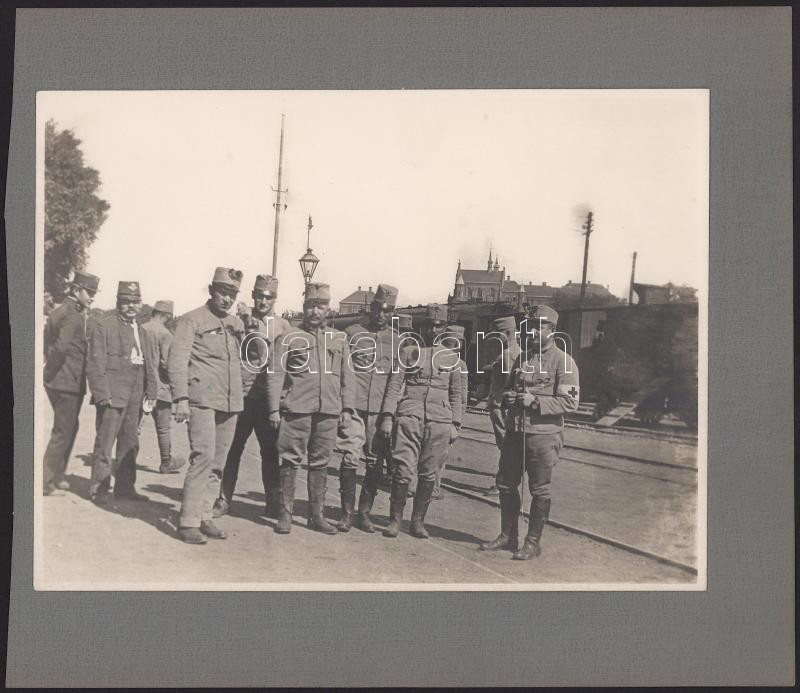 cca 1914-1918 Vonatra várakozó katonák, későbbi előhívás - nagyítás (cca 1920-1930), fotó kartonon, 24x18 cm