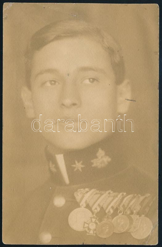 cca 1930 Fiatal katona sok kitüntetéssel, fotó javításokkal, 14×9 cm